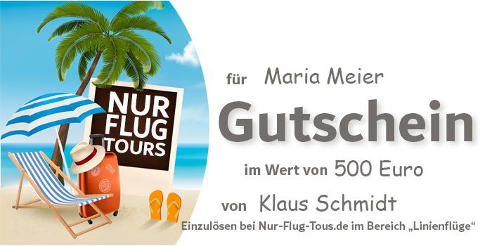 Sie suchen noch eine Geschenkidee? Warum nicht mal einen Gutschein für einen Flug oder Billigflug verschenken? Hier finden Sie unsere Fluggutscheine.